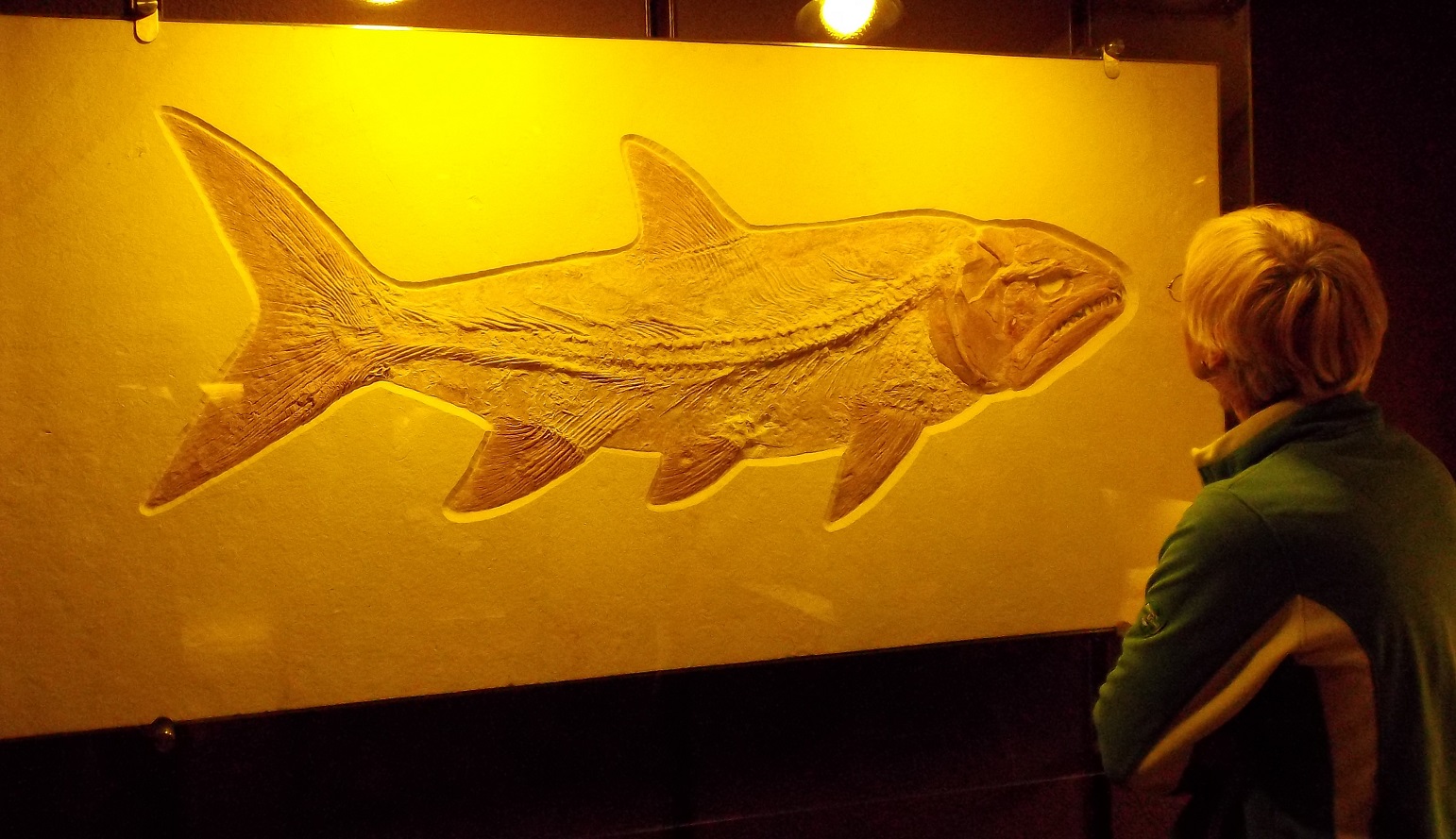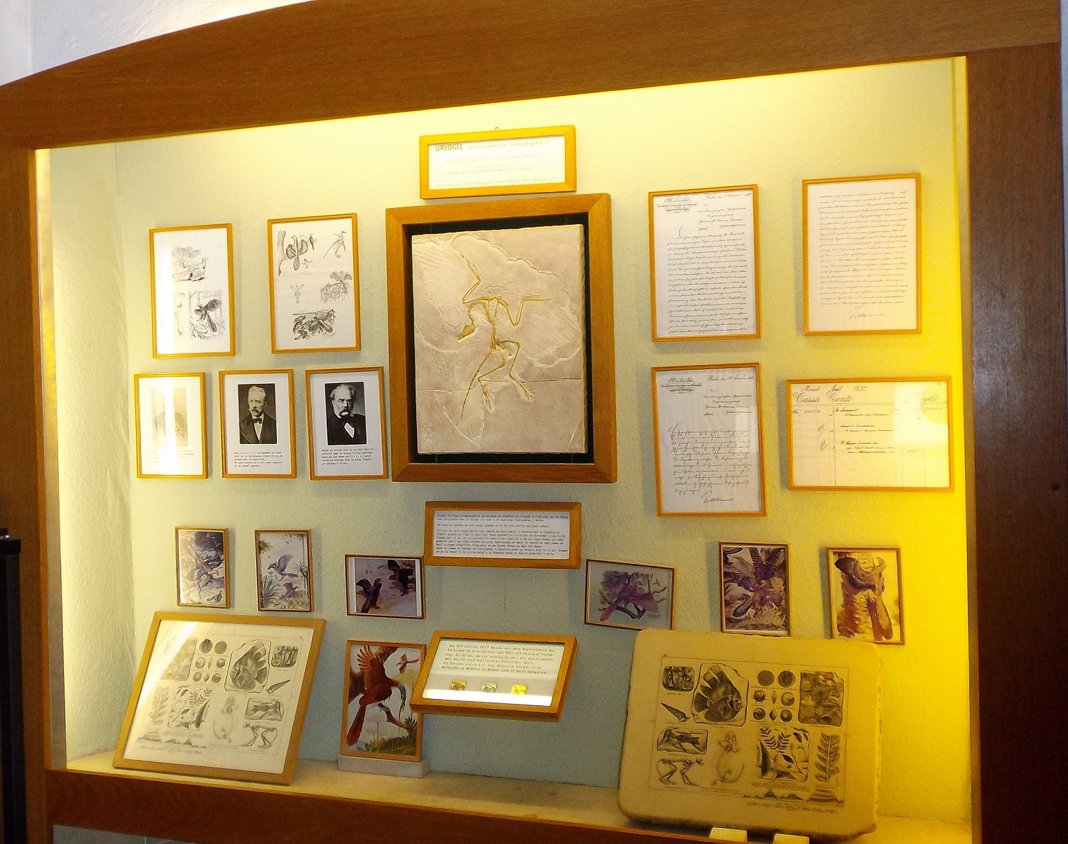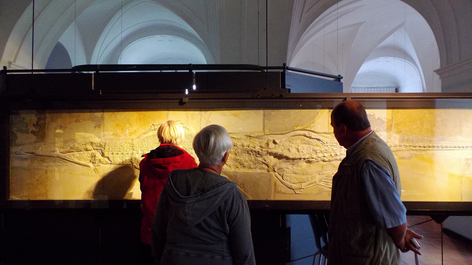 Wenn man im Altmühltal auf Fossiliensuche ist, kommt man an den Jura-Museen nicht vorbei, um seine geplanten Funde zu besichtigen. Das Bürgermeister-Müller-Museum im Solnhofen habe ich bereits am Anfang beschrieben. Unser nächstes Ziel war die Willibaldsburg in Eichstätt. In diesen altwürdigen Mauern ist das Juramuseum mit seinen Fundstücken untergebracht. Was uns sehr gut gefallen hat, sind die Aquarien die uns die lebenden Fossilien (Fische, Korallen, Seeigel, Pfeilschwanzkrebse usw.) zeigten, die man in der Ausstellung mit den Jura-Fossilien vergleichen kann. Gleich am Anfang der großen Sammlung hat eine Sonderausstellung uns sprachlos gemacht. Der Titel war ganz einfach gehalten: „Frischer Fisch aus alten Zeiten“. Diese Fische, die in Ettling gefunden werden, haben eine Farberhaltung wie sie von uns noch niemand gesehen hat. Man könnte denken, dass sie direkt aus einem Fischgeschäft kommen. Leider ist die Grube für Besucher nicht freigegeben. In der Sammlung, die sich über mehrere Räume erstreckt, werden die Prachtstücke aus den 150 Jahren Sammlertätigkeit ausgestellt. Das geht vom Haarstern über Garnelen, Bodenhai, Riesenfisch bis zum über 5 m langen Krokodil. In einer Vitrine werden einige Kopien der gefundenen Archaeopteryx ausgestellt. Daneben kann man das Original des Eichstätter Exemplars vom Archaeopteriyx lithographica (H.v.Meyer 1861), das 1951 auf der Peterhöhe bei Eichstätt gefunden wurde.