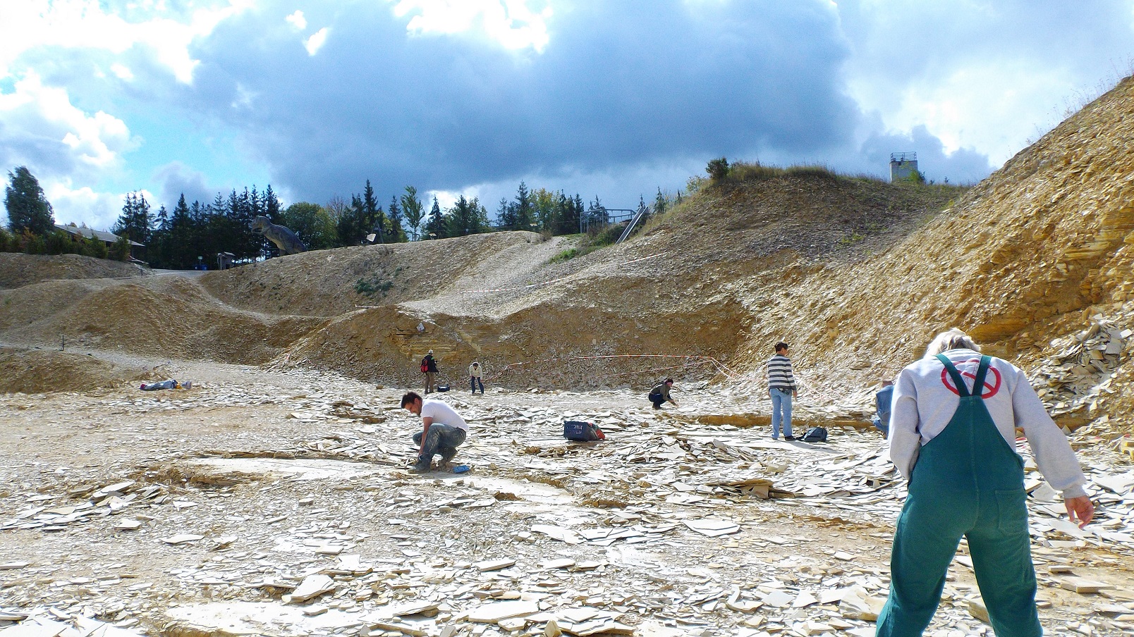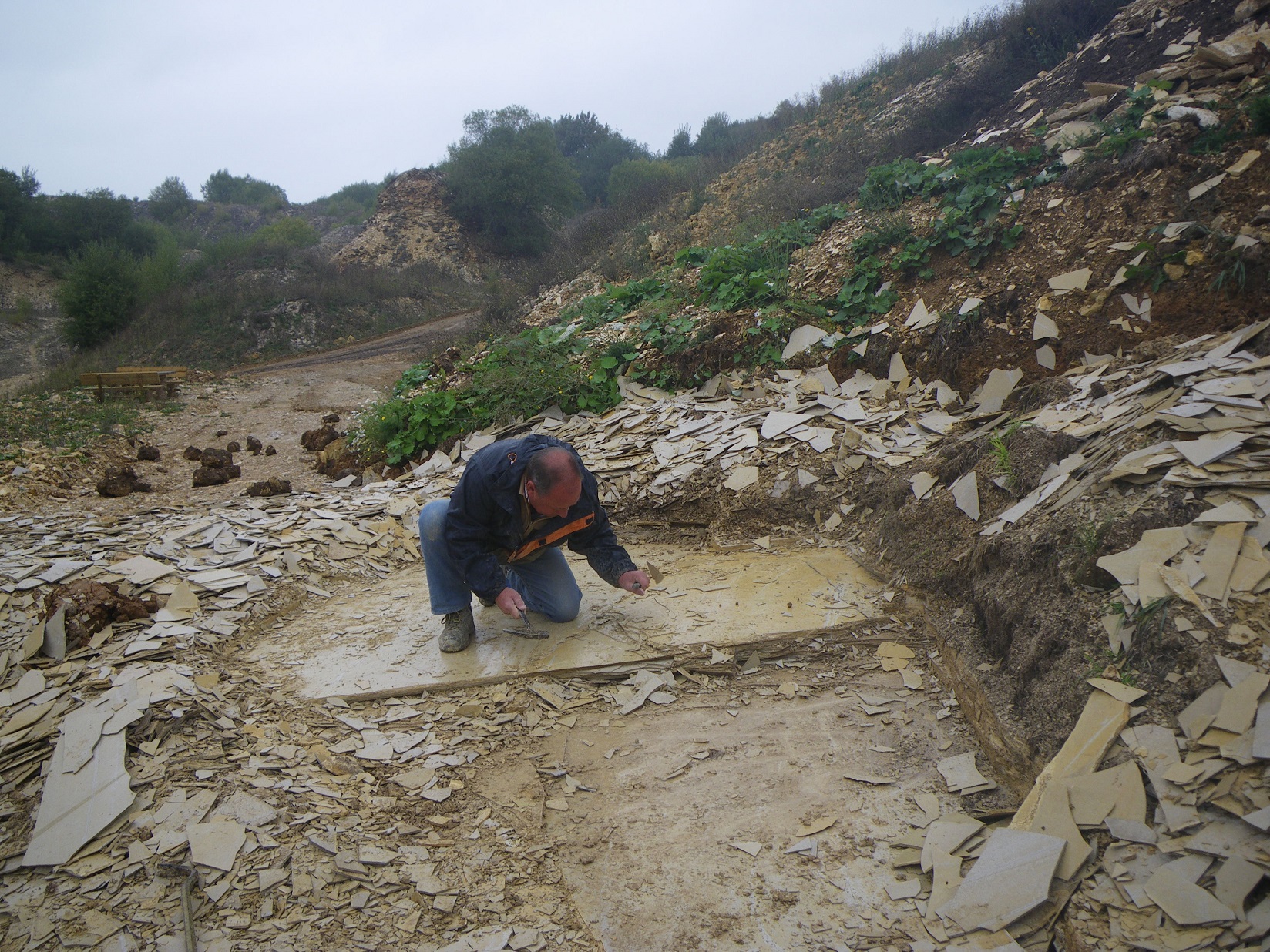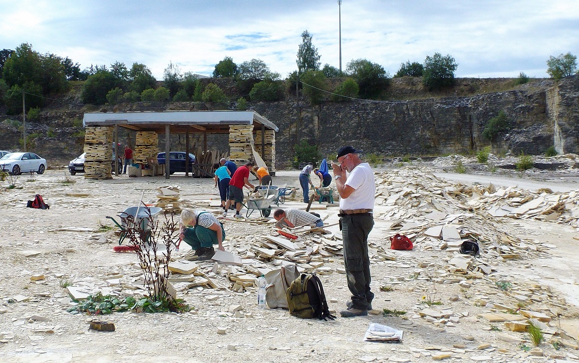 Nach dem Museumsbesuch sind wir gleich in die Grube von Langenaltheim gefahren, um die Fische zu jagen. Obwohl wir einen bevorzugten Platz (auf der Sohle der Grube) erhielten, hat Solveig nur eine Sprotte gefunden. Wir wurden nicht nervös, denn wir hatten ja noch einige Tage vor uns. In den zwei Wochen unseres Aufenthalts im Altmühltal haben wir 4 Touristen-Steinbrüche angelaufen, um die Platten abzubauen und Fossilien zu finden. Unser 2. Aufschluss war der Fossiliensteinbruch Blumenberg. Zu unserem Bedauern klopft man hier zur Zeit in einer Schicht, die nicht sehr ergiebig ist. Unsere Funde waren auch dementsprechend mager.