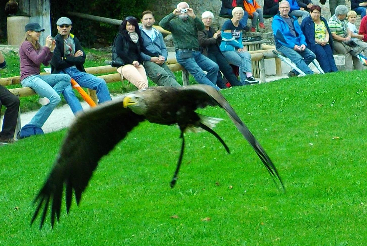 Damit war unser Kulturprogramm aber noch nicht zu Ende. Wir waren noch auf der Rosenburg und haben uns eine Flugvorführung der Falken, Adler und Geier angesehen. Hier wird die große Tradition der Falknerei lebendig erhalten. Die Tiere stammen alle aus der Zucht, die meisten sogar aus der eigenen Zuchtstation. Am Fuß der Rosenburg liegt Riedenburg mit seinem Kristallmuseum. Die Spezialität dieser Ausstellung sind die über 300 Repliken der legendären Historischen Diamanten und deren Geschichte über ihre Besitzer. Das zweite Highlight ist die 7,8 Tonnen wiegende Bergkristallgruppe aus den Bergen von Arkansas. In Pappenheim haben wir die Burg des Reichserbmarschall Gottfried Heinrich besichtigt. Solveig, Karsten und Anke waren noch in Weißenburg um den Limes zu besuchen. Damit waren unsere 14 Tage Altmühltal schon wieder zu Ende und es ging wieder in Richtung Norden.